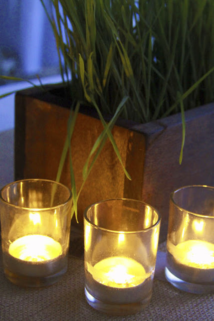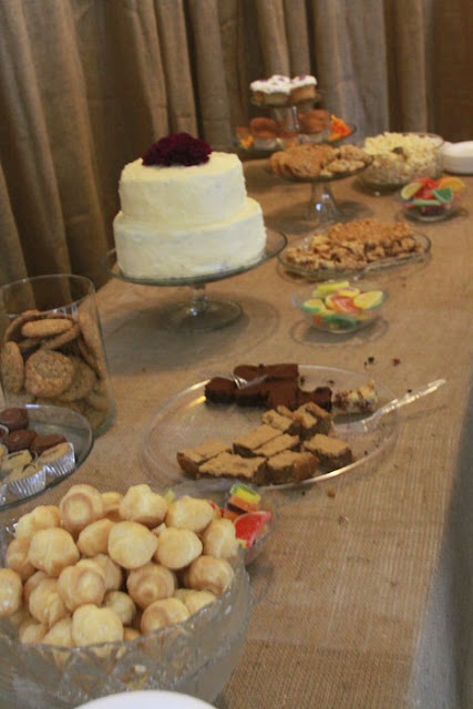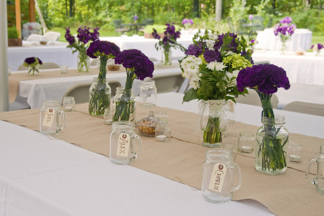 The reception had a three different styles on two types of tables. Each had a burlap runner, which bought online through Joanne Fabric. As you can see, a few friends of mine saved up their baby food jars, which we used as candle holders.