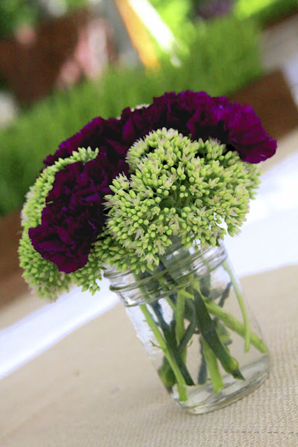 Below: We got all of the flowers from fiftyflowers.com, and did everything ourselves. The green in the arrangement below was found around our house. All of our aunts collected mason jars, which we used as vases.