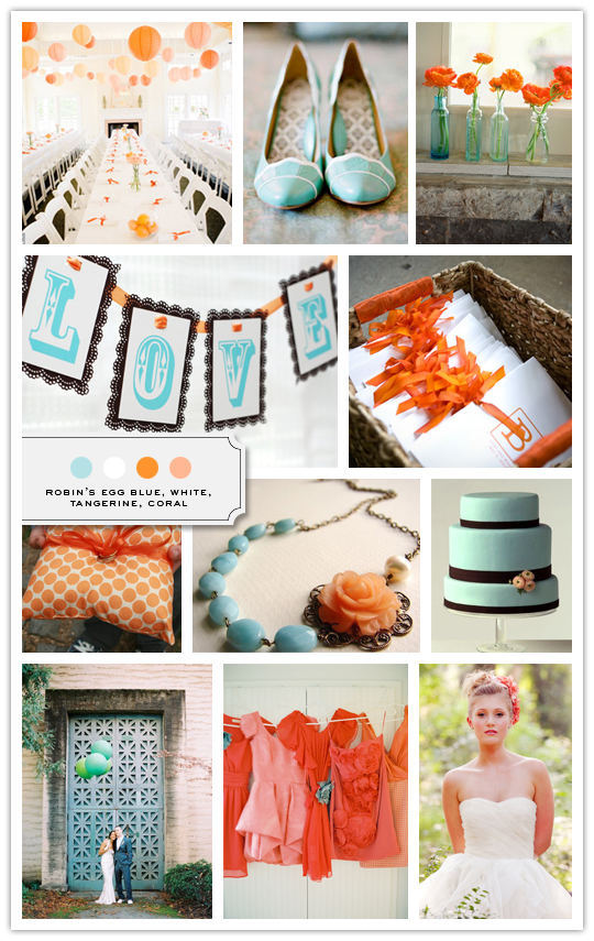 I found this color board over at The Inspired Bride and loved it, not just for wedding colors but more selfishly to use in my apartment. If only I could paint the walls in my apartment! If so I would have had it painted robins egg blue months ago…and of course having pops of orange throughout. {Basically similar to what my sister wants in her new home} But can you blame me, the colors are so neat! Enjoy!