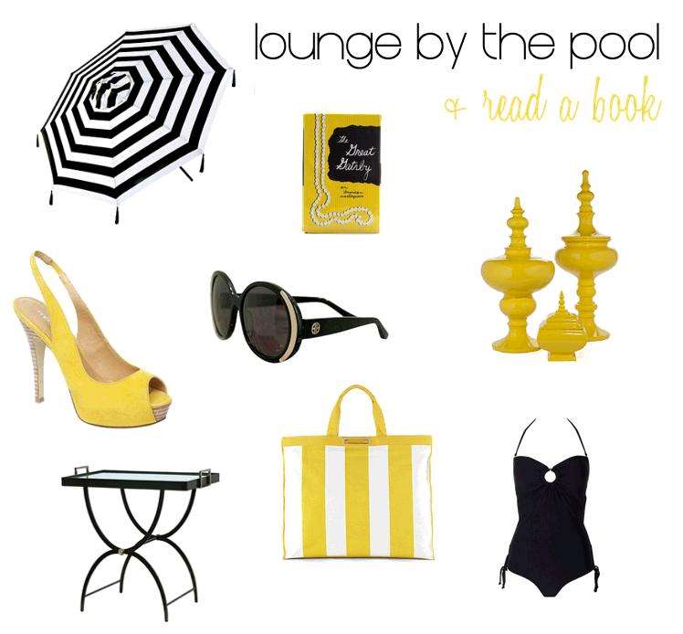 If I actually could lounge by a pool I would love to see this around me! Enjoy! {umbrella, clutch, vases, heels, sunglasses, table, bag, swimsuit}