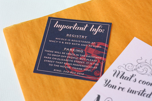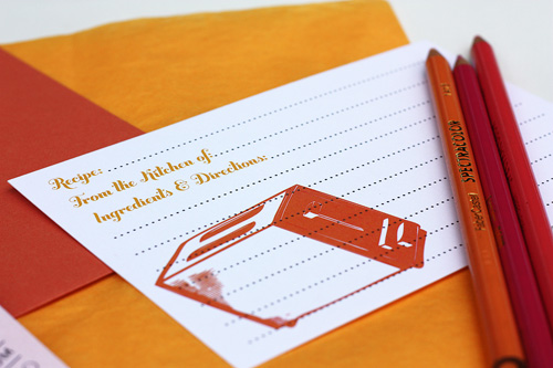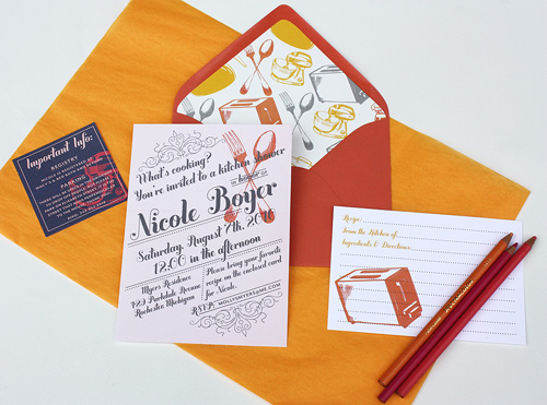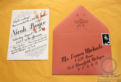 Okay, I’m not sure if I’m stuck on ‘showers’ right now, but I just saw this very cute idea to have a cooking themed bridal shower. I love the unique invitations and fell in love with the envelope liner! Paisley Quill made these lovelies for her sister and even included a recipe card for the guests to fill out and bring to the shower. Love it!