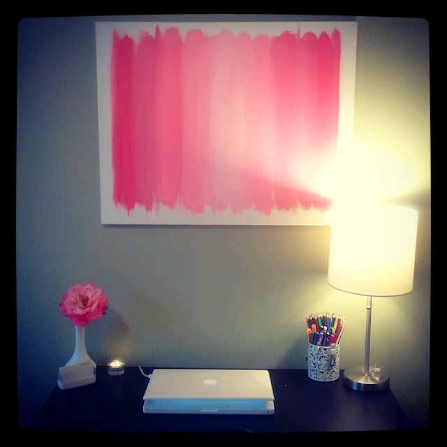 I was feeling a bit crafty and decided to try the ombre hand painted artwork that I saw on Pinterest. I made a large canvas for above my desk, and did some mini’s as well which are for sale in my Etsy Shop! Let me know your thoughts! Enjoy!