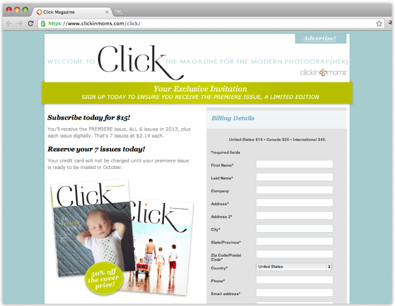 I recently had the amazing opportunity to work with Clickin Moms to create and design an email newsletter to launch their new CLICK magazine for photograp[hers]. Clickin Moms is an amazing photography community built to provide support, tools, forums, tutorials, and much more for female photographers. The new CLICK magazine is just that, full of beautiful inspiration as well as informative articles. After finishing the email they also had me design their sign-up web page. The best part of working with them is that they gave me complete design freedom and just asked for something that is visually clean with a personal touch. The final product is below and if you sign up it is only $15 for 7 issues, you cannot beat that! BONUS: If you signup for the magazine you will get to see some more of my designs firsthand! Enjoy,