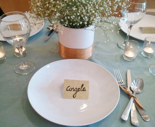 Happy Thanksgiving to everybody! I hope you all had a great dinner with some great people! I thought I would update you with my little turkey day dinner. Like I posted below I wanted to go with a Gold, Bronze, Turquoise, and White color scheme. Well what do you think? I actually had other plans in mind. I wanted to create a centerpiece with gold and bronze painted pumpkins and some sort of candle arrangement, (tapers, floating, or just votives)…well I soon found out that North Carolina doesn’t sell pumpkins or gourds past Halloween (what!?), yeah! So then I thought I would find some neat leaves that I could paint or even create a centerpiece with…well I also found out there are not many tree’s with large leaves around here. I had the option of buying leaves, but for some reason that just seemed silly. So this is what I went with, some bronze/gold ribbon and baby’s breath. I couldn’t even find a blue linen at the rental place so I used a curtain. But, all in all it all turned out great. This was my first Holiday away from home, and you know what it was perfect. I was able to decorate the table, eat delicious (Italian) homemade food, have great conversations, and even took a walk down to the boardwalk while sipping on coffee (w/chocolate vino). There was a crisp breeze which made it all perfect. So to everybody, I hope you had a lovely Holiday and wish you a happy weekend!