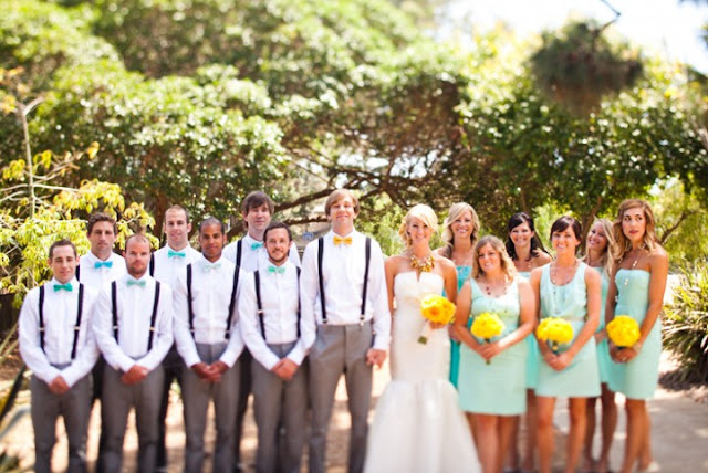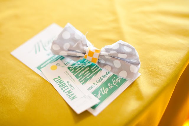 How cute is this wedding! Bright yellow bouquets, bow-ties, peacock feathers, and yogurt…what more can you ask for! This playful, bow-tie wedding was executed by the lovely Jesi Haack, with floral design by JL Designs. To check out more pictures head over to Aaron Shintakuwho captured the wedding beautifully. Enjoy!